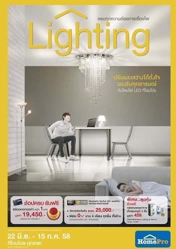 โฮมโปร จัดแคมเปญ “Lighting ครบทุกความต้องการเรื่องไฟ ตั้งแต่วันที่ 22 มิ.ย. – 15 ก.ค. 2558 ณ โฮมโปร และโฮมโปร พลัส ทุกสาขา พร้อมกับจัดรายการช้อปครบ..รับฟรี สำหรับลูกค้าสมาชิกโฮมการ์ด ช้อปครบทุก 30 บาท รับ 1 คะแนน ช้อปครบ 40,000 บาท รับฟรีชุดจาน-ชาม 24 ชิ้น มูลค่า 1,490 บาท หรือคะแนนสะสม 1,333 คะแนน ช้อปครบ 80,000 บาท รับฟรีเครื่องเตรียมอาหารอเนกประสงค์ มูลค่า 3,490 บาท หรือคะแนนสะสม 2,666 คะแนน ช้อปครบ 120,000 บาท รับฟรี สร้อยคอทองคำ 1 สลึง มูลค่า 5,100 บาท หรือคะแนนสะสม 4,000 คะแนน ช้อปครบ 400,000 บาท รับฟรี สร้อยคอทองคำ 1 บาท มูลค่า 19,450 บาท หรือคะแนนสะสม 13,333 คะแนน พิเศษ..สุดคุ้ม เมื่อช้อปสินค้าแผนก Lighting & Electric ครบทุก 10,000 บาท รับฟรี กล่องบรรจุอาหารเก็บอุณหภูมิ 3 ชั้น มูลค่า 459 บาท